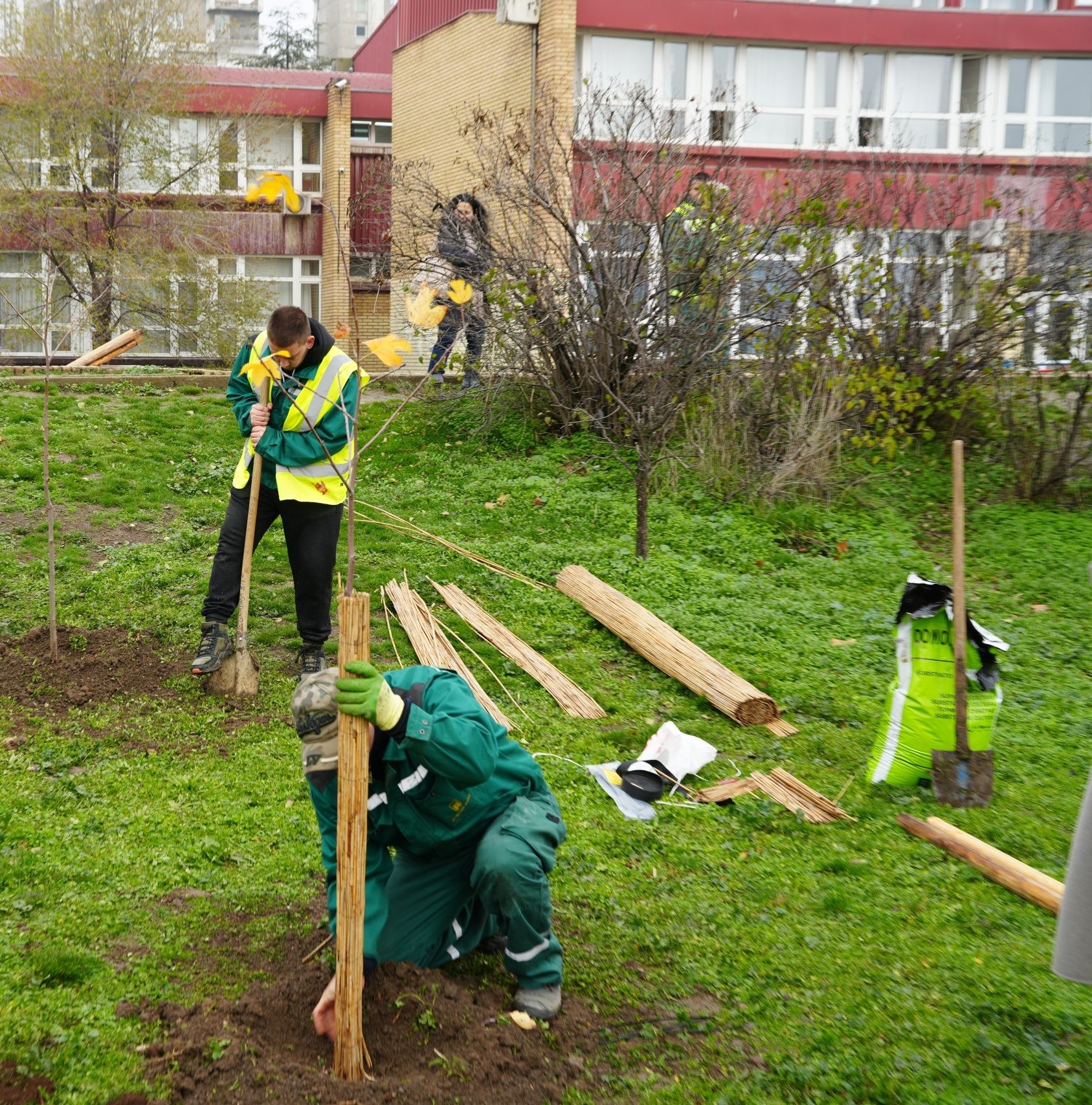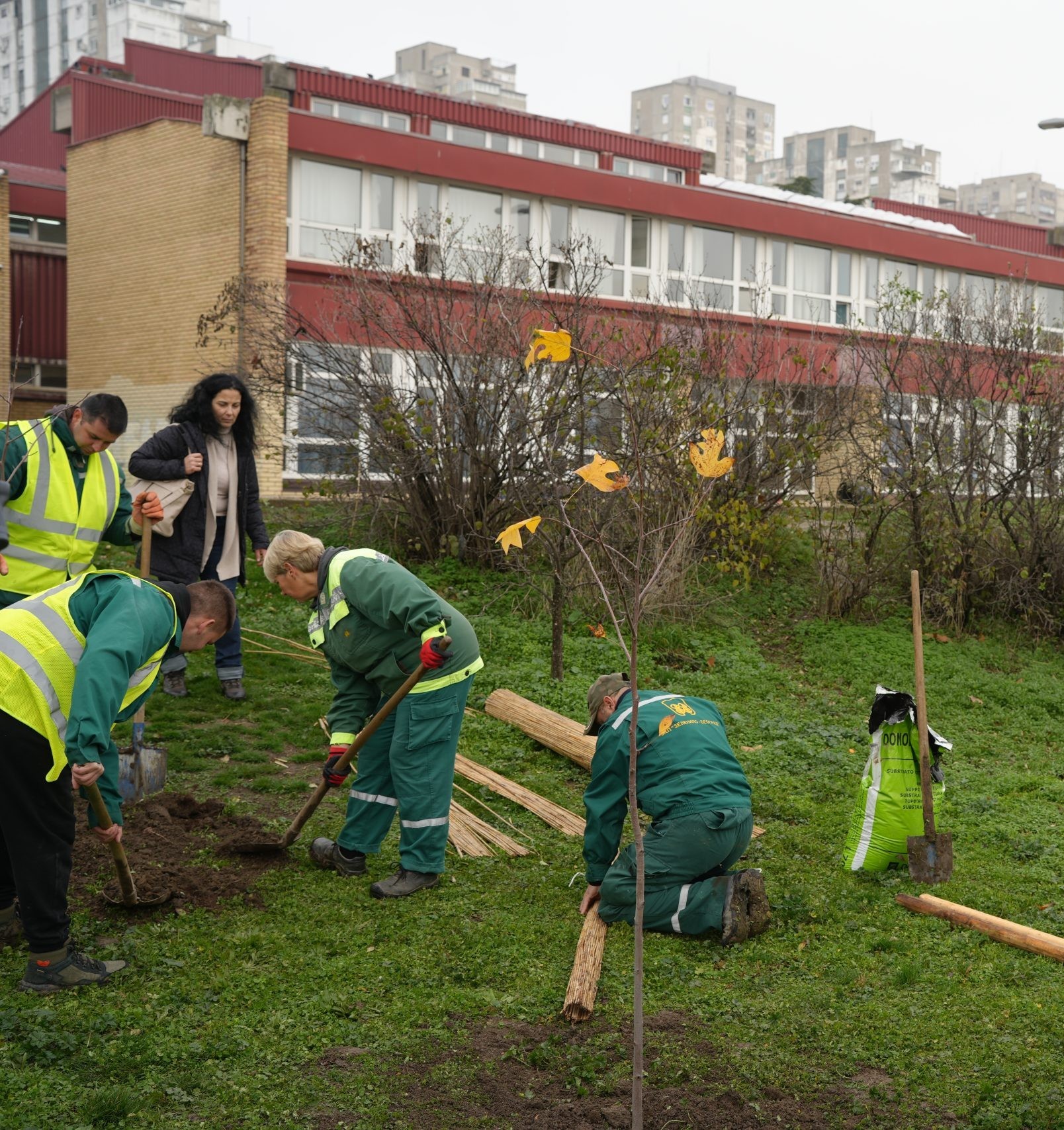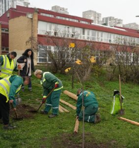 У акцији садње у дворишту учествовали су председница Градске општине Нови Београд Ивана Николић, директор школе Драко Егер и Мирјана Обућински из ЈКП „Зеленило Београд“.