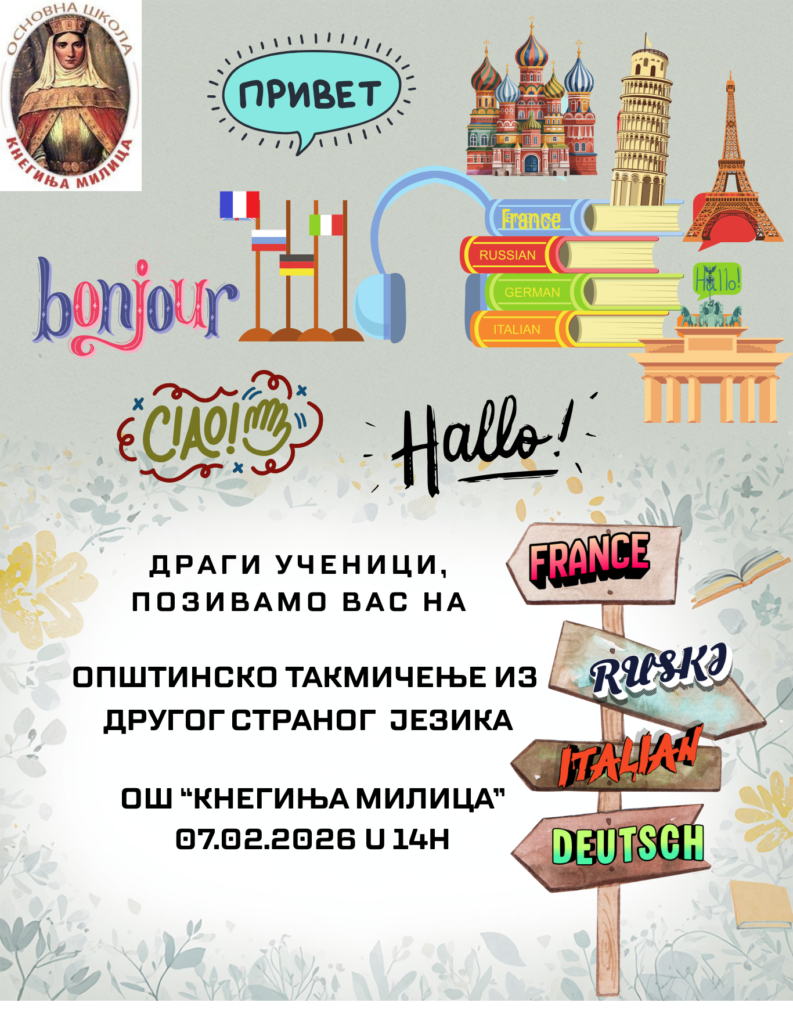 У ОШ „Кнегиња Милица“ 07.02.2026. године успешно је одржано општинско такмичење из другог страног језика (немачки, француски, руски и италијански). Такмичење је окупило велики број ученика који су показали интересовање, знање и љубав према учењу језика и упознавању других култура.